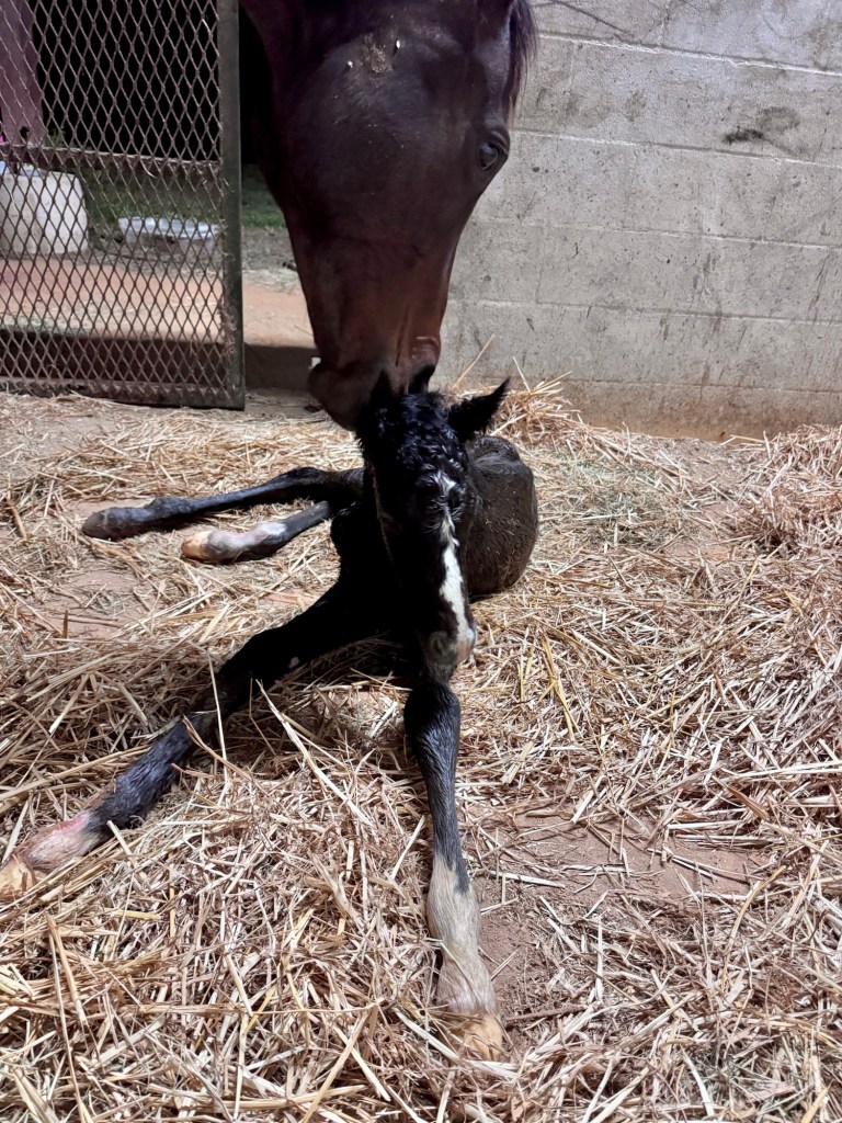 Fey belongs to me and Hillary, and this foal is Hillary’s, plus it’s Fey’s first. Her registered name will be Uphoria, barn name Phee, and she’s bay but will go gray like her sire Future Guilty Pleasure. She is very very cute and Fey is being a fantastic mom. I think she likes the job! This filly is already sold, to a 4* rider.