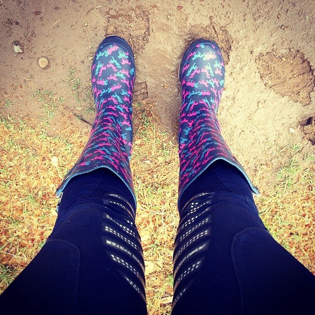 But I am not one to be deterred by simple things like the weather. I figured this was a chance to make lemonade out of lemons, so I pulled out my rain boots and away I went to the barn after work. Side note: these are the fabulous rain boots that I got for $12 on clearance. They combine all of my favorite things: blue, ponies, and shoes. It’s like we were destined to be together. We’ll ignore the fact that I live in Texas and muddy days are few are far between, so in 6 months of ownership this was only the second time I wore them. Alas, I digress…