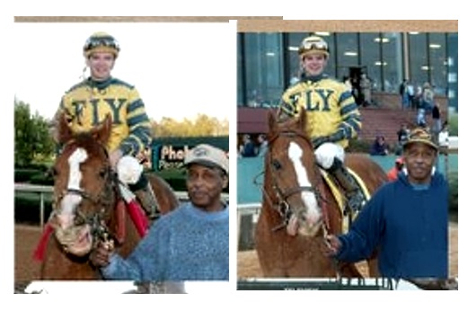 While I was digging manically browsing through the Internet a couple weeks ago desperately looking for pictures of Henry’s sire, I came across a couple of tiny photo collage proofs from his Oaklawn wins. I just about died of hysterical fits of the giggles when I saw these pictures. Meet Henry’s sire Skeet.