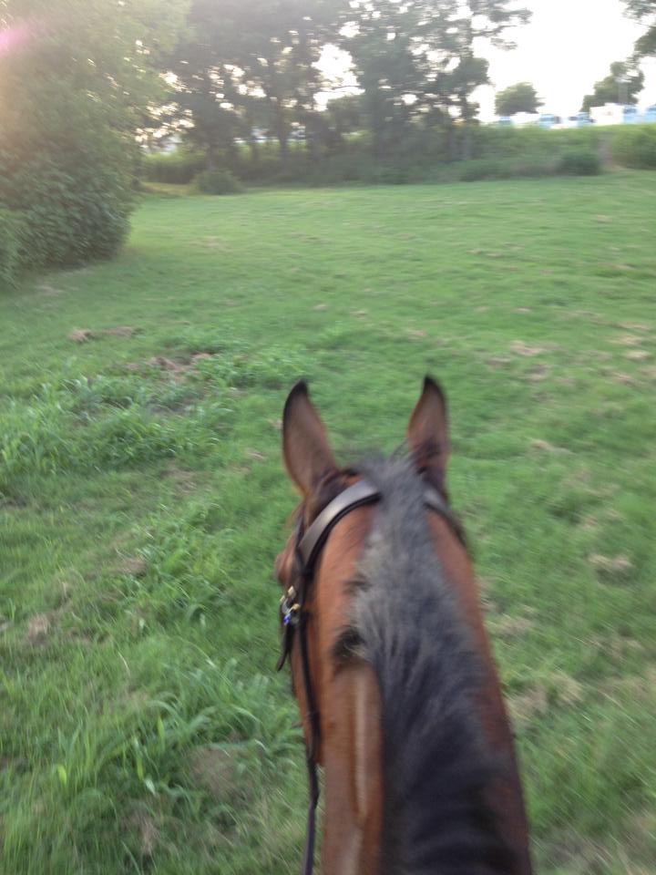 I rode him in both rings and around all the fields. He was a little nervous and snorty about things, especially the big ring with all the jumps and standards. That’s pretty normal for him on a first ride at a new place though, he thinks everything is gonna eat him. He was really good for hacking out in the fields though.