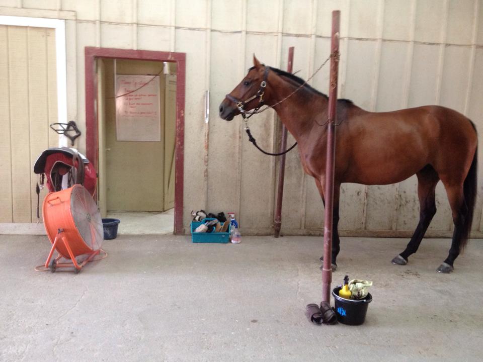 Then I got pony out to tack him up. I think he was really digging the giant industrial powered fan in the crosstie, considering it was still 93 degrees. Also interesting to note: he’s had a runny eye for about a month now that has not gone away despite all my efforts, and all of the sudden within 24 hours it’s gone. Coincidence?