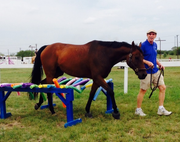 After we were done and back at the trailer (and Henry’d had about two dozen cookies) some other mutual friends of ours, a husband and wife, came up to chat. In addition to riding, the husband has a real penchant for in-hand work and the little versatility trail course that was set up at the show was too much for him to resist. I handed Henry over and let them go play around over the trail obstacles. By this point Henry was giving me the eye like “What is this, musical pony?” but he gamely went through the weave poles, the tightly stacked hay bales, the cross of poles on the ground, the curtain of garden hoses, the teeter totter, and the pool noodles. This horse is just too much.