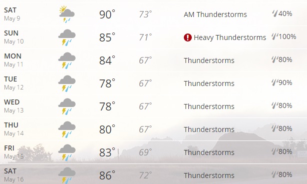 Your forecast looks a lot like mine here in Kansas, minus the 80 and 90 degree temps! We had my first tornado watch on Wendesday night. Stay dry this weekend, hope you get some good schooling in!