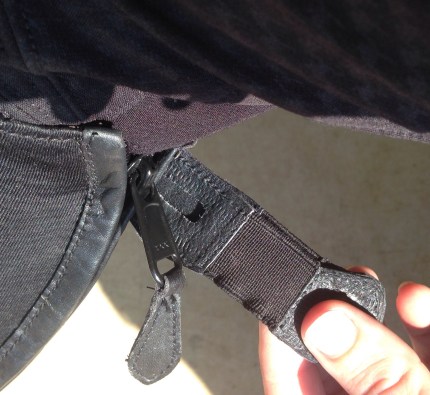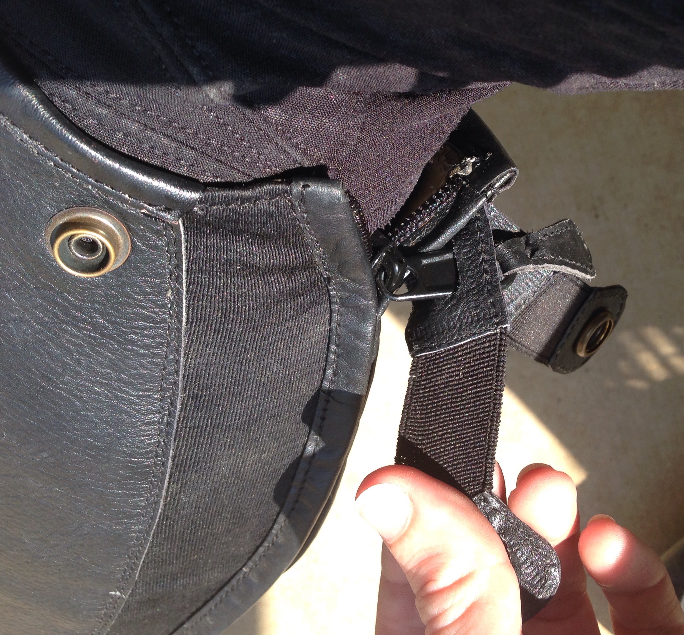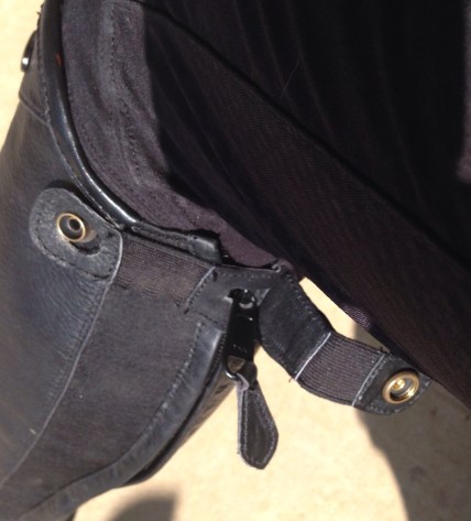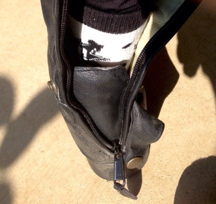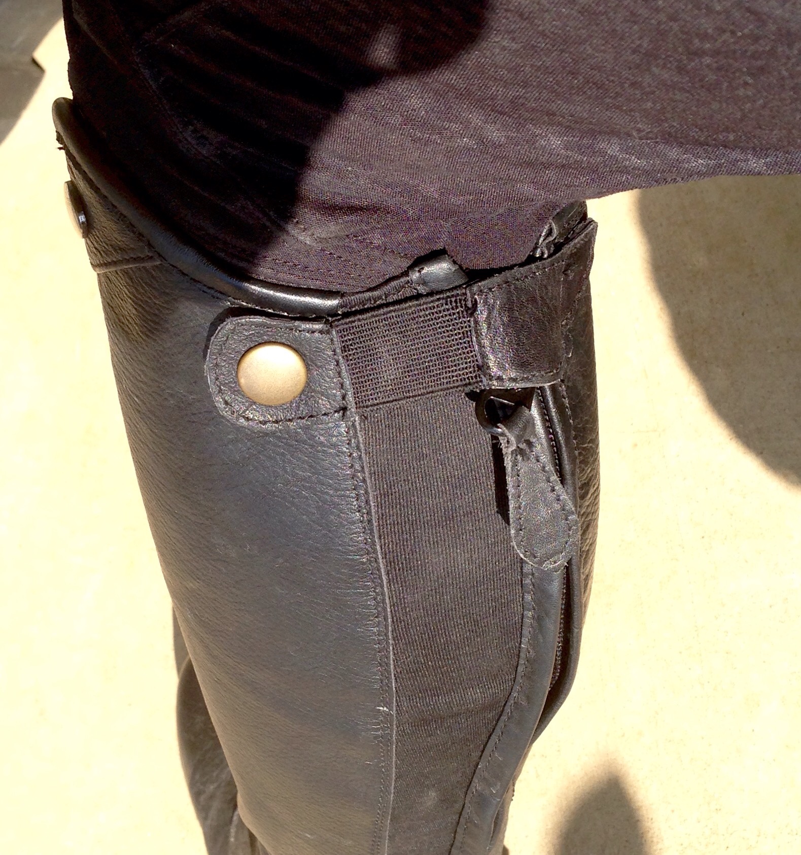 Another interesting feature, which is very useful albiet a bit of a PITA, is the zipper keeper. I really have no idea what it’s actually called, but that’s what I’m calling it. On the strap that runs across the back of the knee and snaps to the other side, there are two layers of strap. The bottom one has a little rectangular hole in the leather part to thread the zipper through so that it stays put while you’re riding. These boots are so thin and soft that if you don’t secure the zipper through it’s keeper, they tend to come unzipped as you’re riding. So to prevent that, you stick the zipper through it’s little rectangular hole…