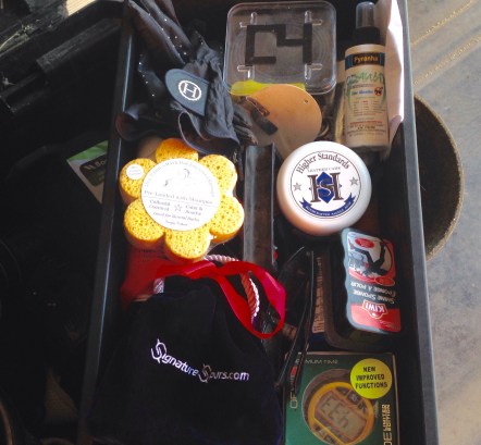 These beauties will live in their velvet pouch in my tack trunk and be reserved for horse shows or other special occasions where my “everyday” spurs with their rubber straps might not be so glamorous. I love the fact that if I ever accidently leave them behind somewhere, there’s no doubt who they belong to. Hopefully this means we’ll have a long and happy relationship.