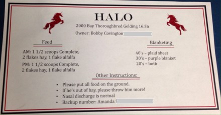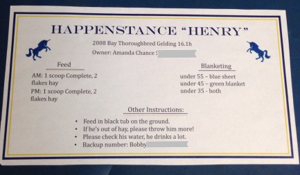 Stall cards in general are one of my favorite things. Most of the barns I’ve been at over the years have put some kind of information on the horse’s stall. Sometimes just name and how much they ate, other times everything from basic info to blanketing information. As someone who has worked in a barn (and still barnsits sometimes) I love having it all right there on the front of each stall. It takes all the uncertainty out of everything, and makes it so that just about anyone can step in, if necessary, and care for the horses.