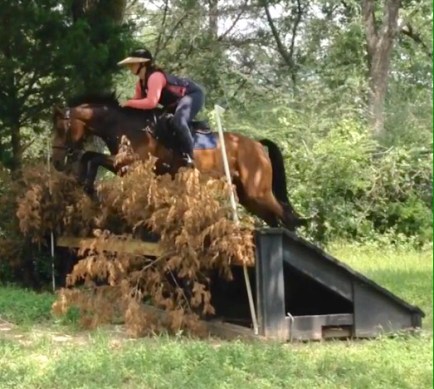 He definitely did take a flying leap off the Irish bank with a big peek down into the ditch on the way down, and it was not beautiful, but Trainer did a great job of slipping him all the rein he needed, staying balanced over the back, and sticking out the awkward leap. Definitely glad it was her riding him off of that thing for the first time and not me! Really happy that he was so game about it though, there was never any question about whether he was gonna go or not.