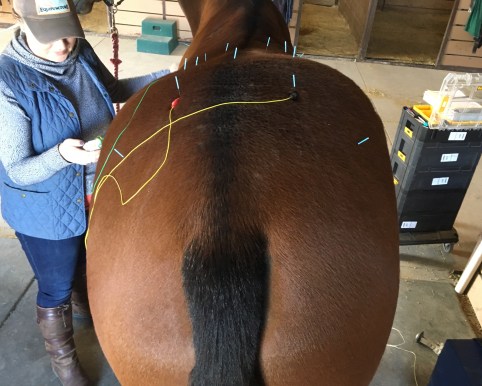 Then we moved on to the acupuncture. I wasn’t sure how Henry would react (he is a HUGE wuss about, uh, everything) but he didn’t seem to notice as she stuck a couple needles at his poll, a couple more in his chest, his neck, his legs, and then basically made a giant pincushion of his SI area. The only one he reacted to was the right fetlock, which she said connected to the spot where he was so “out” in his neck. Something about meridians maybe? I dunno, here, learn things: