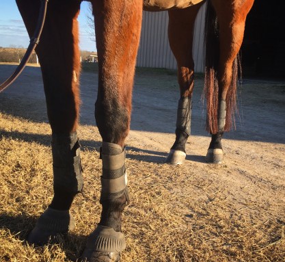 I had to go through a few brands of front boots before I found some that didn’t spin on him. And because he does interfere so much, he’s very very hard on his front boots. He also has to wear bell boots 24/7 because I’ve never seen a horse that can pull a shoe like this one can. He steps on his own feet a lot.