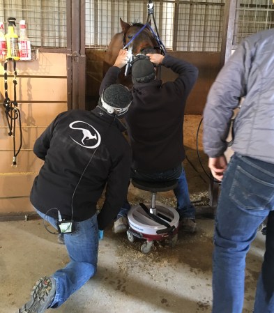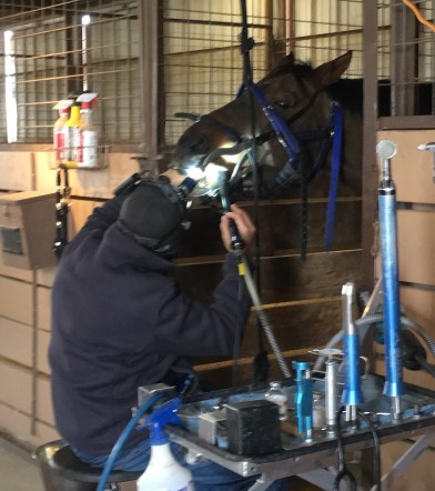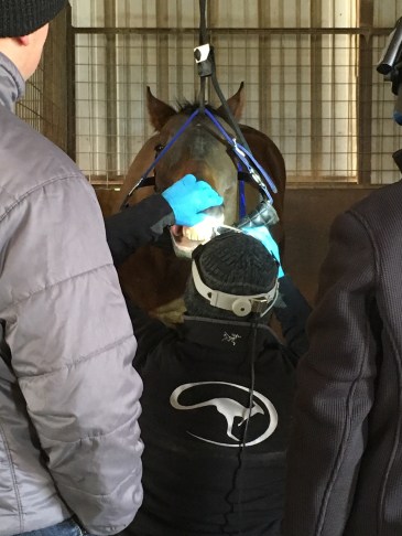 The vet did his exam before he started his teeth (obviously, because it’s hard to trot drugged horses) and I talked him through the entire history of these random minor things that have come and gone, what I notice under saddle, everything we’ve done so far, what patterns we noticed with the acupuncture, etc etc. He’s worked with my acupuncturist before so it was nice to be able to hand him her exam paperwork from Henry’s appointments so he could see exactly what she had noticed. He palpated his back and SI area, watched him w/t/c on the lunge line, flexed his hocks, and then watched him walk and trot away and back.