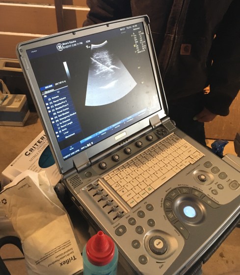 He felt like it was prudent to start with just the right side (since he really wasn’t seeing any sensitivity on the left) and see if that does the trick. I was on board with trying the less expensive, less invasive option first. The fewer needles we stick in, the better. Once the injection was done, he ran the ultrasound up Henry’s spine looking at his vertebrae, just because he was already up there with the machine, to make sure he didn’t have any kind of kissing spines going on. All looked good until he got to the middle, right at the lowest part of Henry’s back. Then we could see that there were a couple spots where the space in between his vertebrae was reduced.
