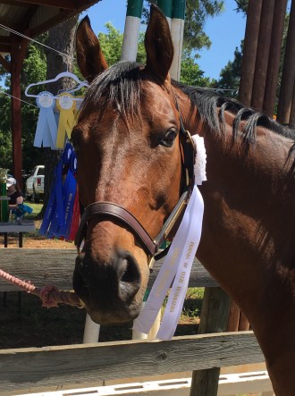 After that it was just a hop over another stadium fence and around the corner to the little brush box at the finish. Aside from the rail at fence 2 we were clear, so we added 4 faults to our dressage score. Still, there were enough issues to move us up from 6th to 4th. Mostly though I was just really thrilled that he went down the bank. We definitely still need to keep rebuilding his confidence more, but good to know he isn’t totally broken about it.