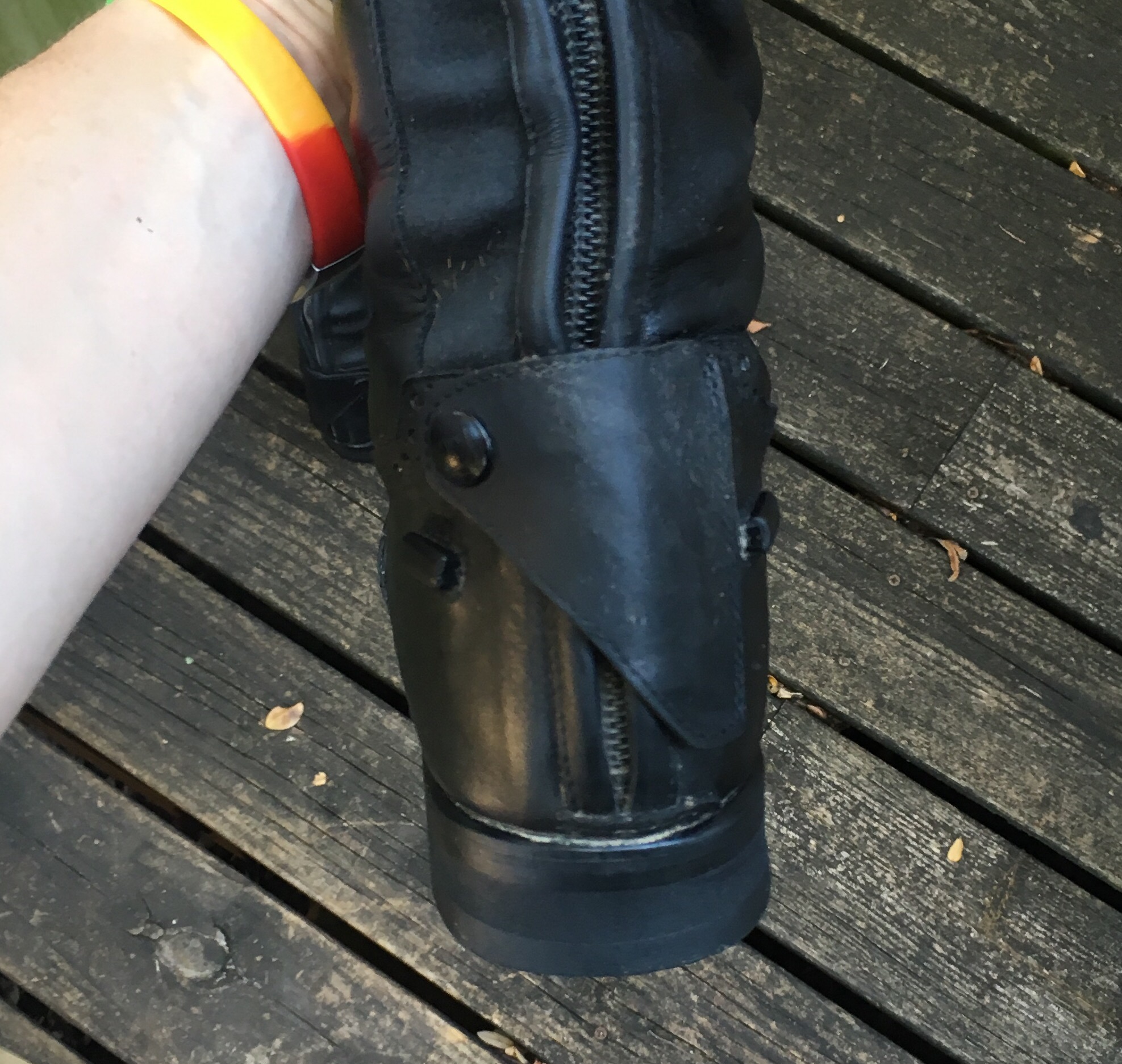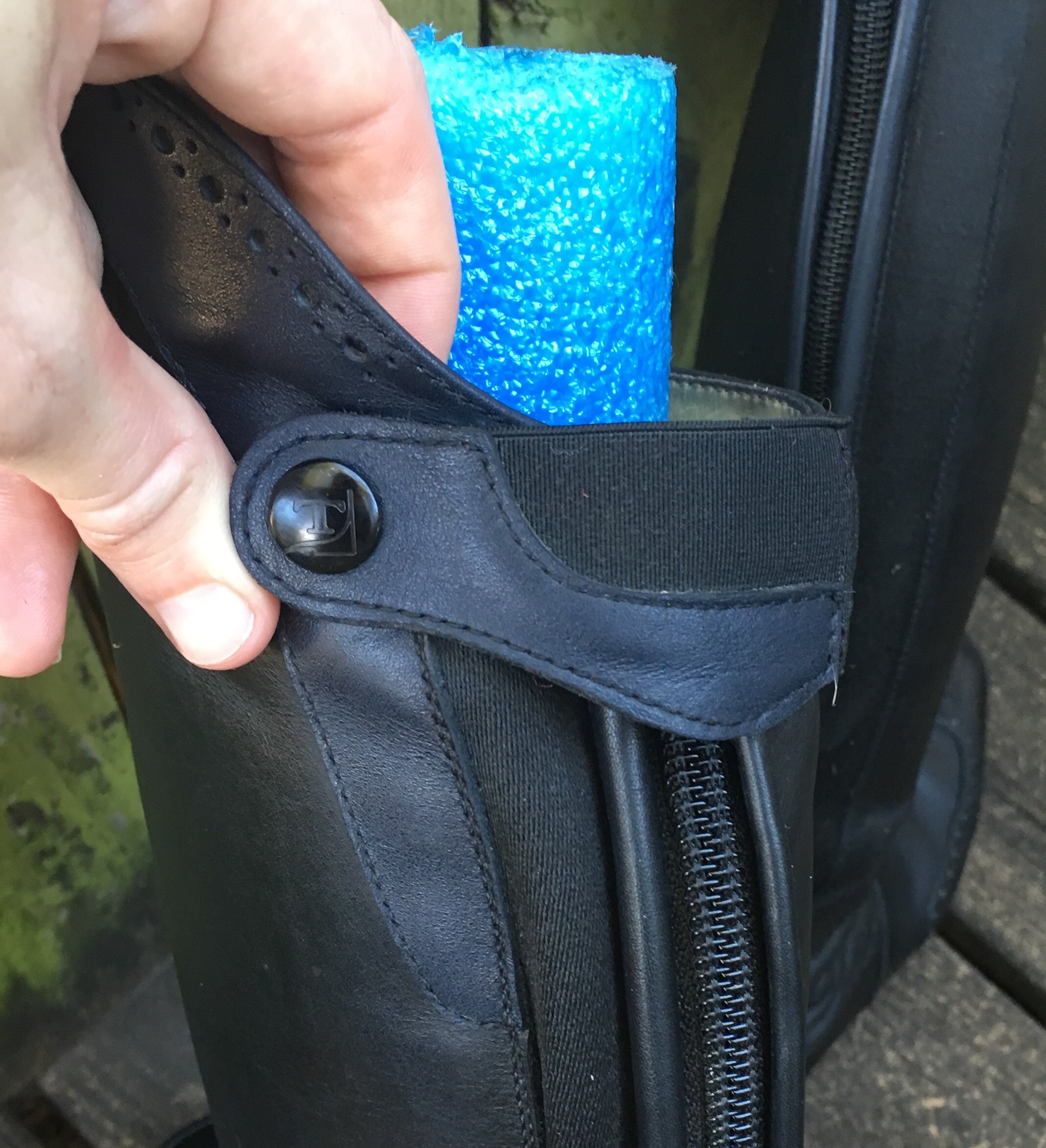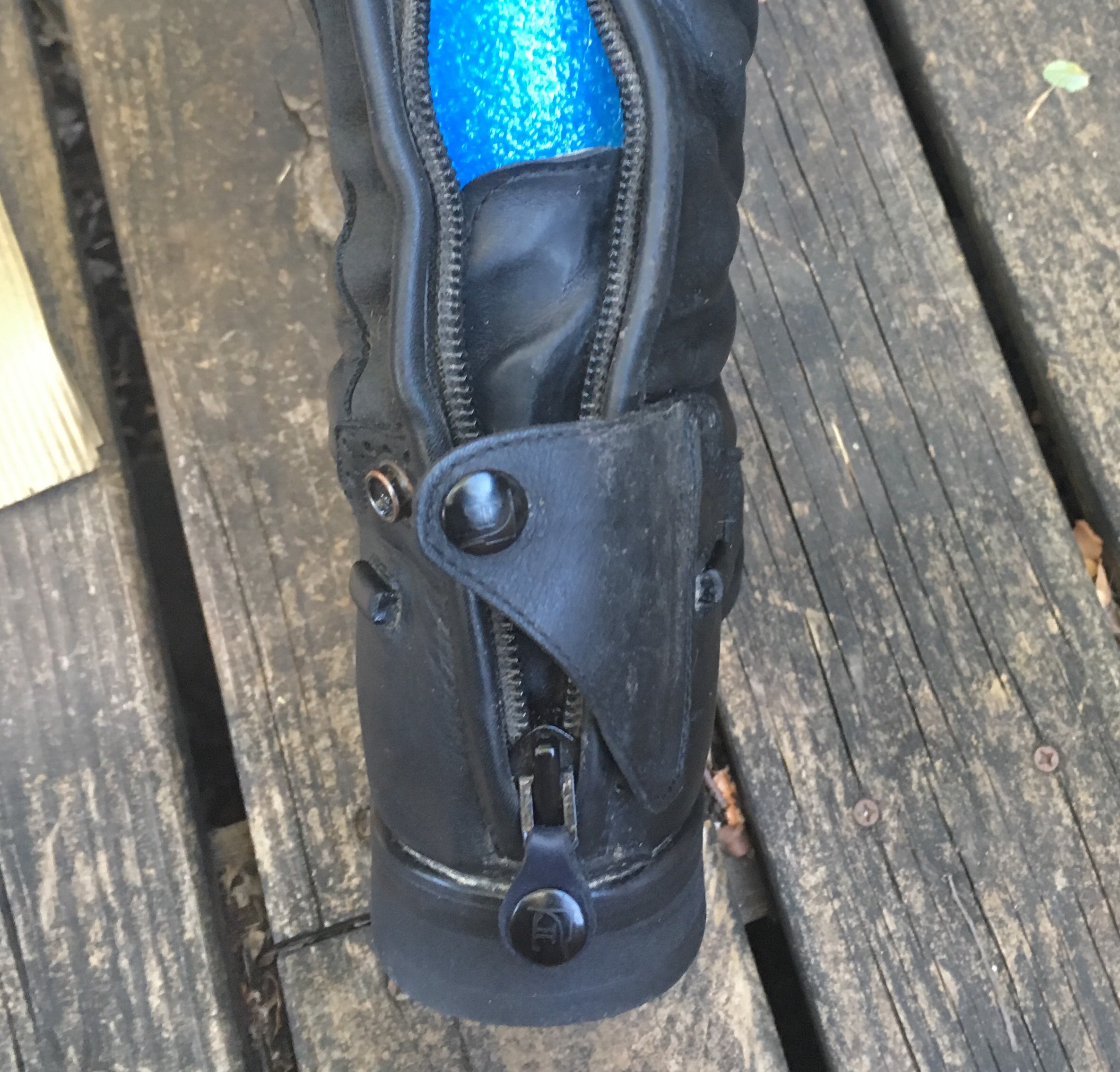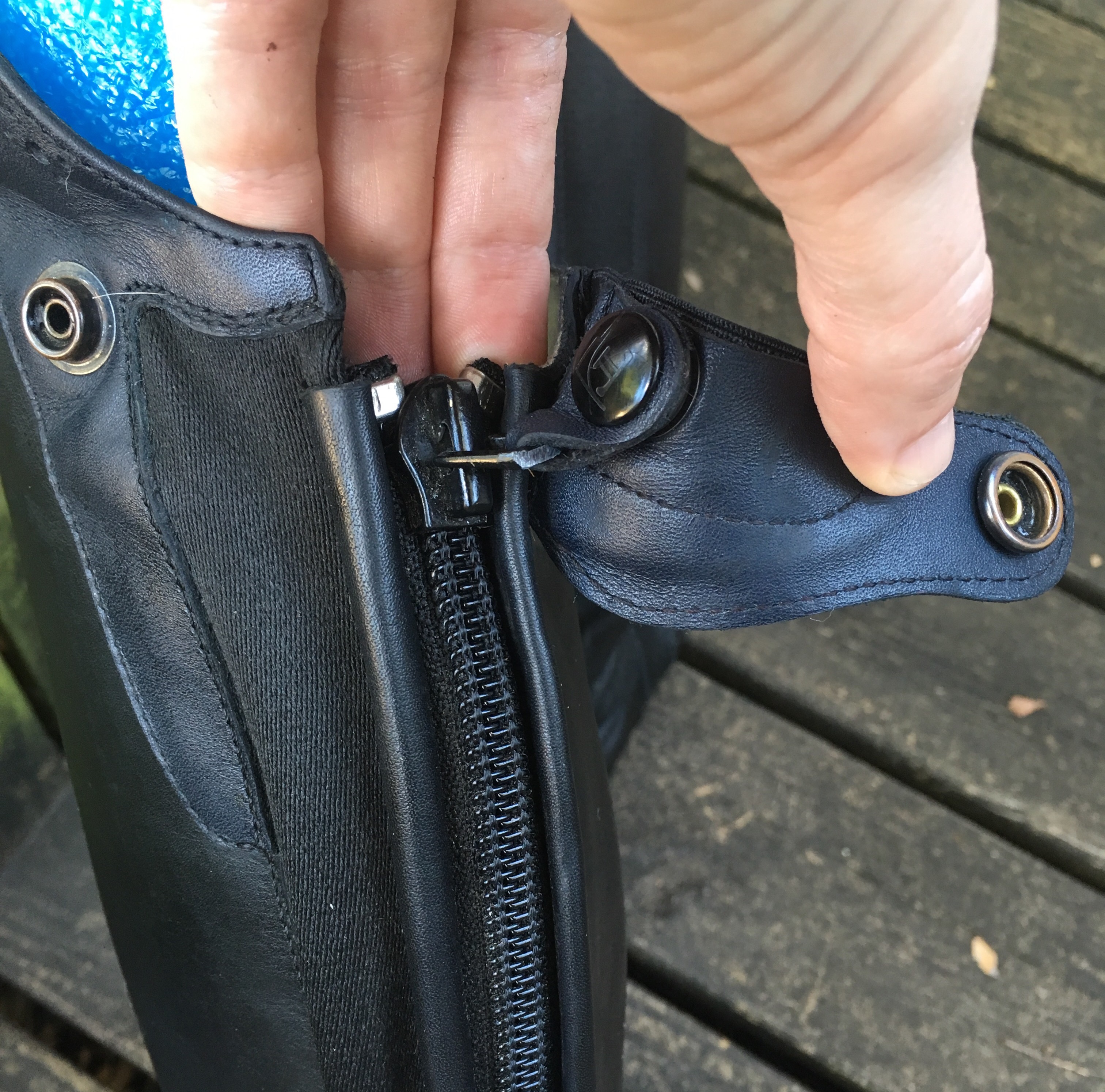 They’re made in Italy and the design features were obviously well thought out. My favorite feature is their snap system. Zippers that won’t stay up seems to be a pretty common problem with tall boots, especially as they get older. I’ve had a couple brands that had a little slot on the strap in the back to thread the zipper through, but 1) that takes effort, 2) it didn’t always work. The Tucci’s have a snap tab on the zipper that snaps to the strap at the back of the knee, locking everything securely in place. Snaps are a lot easier than threading stuff through a hole.