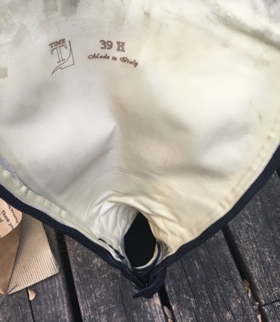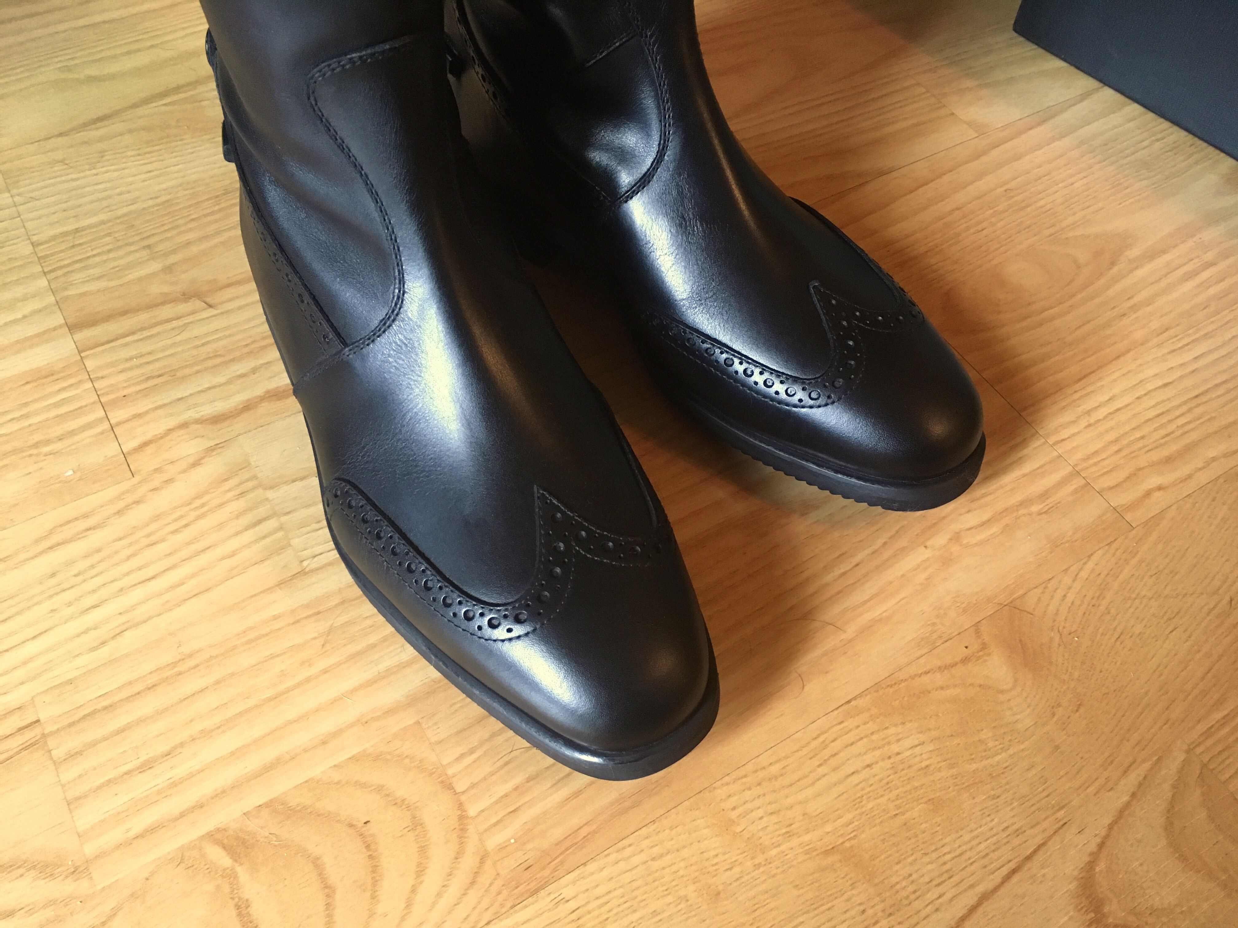 I’m lucky in that I did not require full customs to get a custom fit. I’m a fairly average size, plus Tucci has a TON of size combinations, so those two things combined saved me from having to go the full custom route. Mine are just considered semi-custom, since I ordered them with a navy top… they’re the Marilyn model, so the wingtip toe and the fancy punched top come standard on those. It was pretty simple to get fitted to figure out my size, and I then just ordered the standard Tucci Marilyn but with a navy top from Luxe EQ. I did order them quite tall on purpose, because I can’t stand a tall boot that’s even a hair too short. I have chunky thighs, super tall boots help my leg look longer and slimmer. Don’t judge.