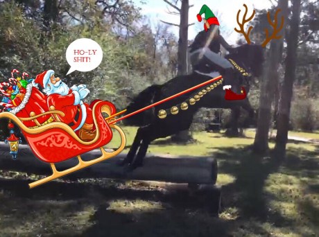 The other belongs to Lofty‘s mom Kathy, who has only had him for a couple weeks but he’s a super bold and willing guy. This one is also quite smart, and looks like he’ll make up to be a cross country machine. He really didn’t even look twice at anything until we got to the little faux trakehner back in the woods, which he took exception to by leaping, like a deer, sideways across it. It was hilarious in the way that only green horses can be, as he was flying through the air to a chorus of shrieking laughter from the peanut gallery (myself included). And if that happens in front of me, I will absolutely Photoshop that picture. Say hello to Blitzen. I love him. (and I have no idea what his actual name is)
