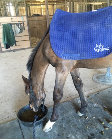We ended by walking over some poles in hand, which he plodded right over no problem. We were out there for a total of 11 minutes… that’s how fast he got all of those concepts. Then I took him back to the crosstie area to give him his soaked alfalfa pellets + oil. I’m trying to get more condition on him, he’s so growthy and scrawny looking right now. Plus I want him to associate that area with good things, and look forward to coming inside for his lessons. While he ate I draped the lead rope across him, around his legs, picked up his feet again, and tossed a saddle pad all over him. He kind of just gives me the same “You are LITERALLY the most annoying person in the entire world but FINE” look that Henry gives me all the time. He did think I was trying to murder him when I got to the fly spray part though.