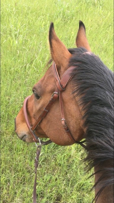 We went off and did our warmup trot, did a couple of canter sets, and then I aimed him at the box. The first time he leaped WAY up over it, not knowing what the heck it was, but he went straight over it. Extra points for honesty. Then he thought it was quite a fun game, and we jumped it off of each lead. At that point I was like “I really need this on video”, but alas… I was alone and there was nowhere nearby to set my phone. So instead I decided I’d just hold my phone and video it that way. Which required holding both reins (of my sidepull) in one hand, and holding the phone steady with the other. Could I even steer that way? Guess we’d find out.