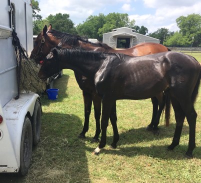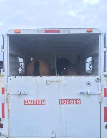 Which we should all get extra credit for, because I don’t have functional butt bars at the moment and was wondering how the hell that was gonna work, trying to load two by myself. But these kids are saints, so it was as simple as leading them both out together, having Henry self-load, and then leading Presto into the other side, leaving them both to make faces at each other over the hay net while I went around and shut the ramp. I am lucky to have two easy loaders/haulers. That could have been way harder than it was. The next big thing for Presto to learn is how to self load, so I can just point both of them at the trailer and not have to worry about it.