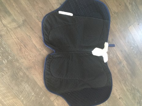 The saddle pads were first to launch, back in the summer. The line includes a non-slip all purpose pad, a mesh bamboo pad, a sheepskin half pad, and a shaped Impact pad. The half pad and the shaped pad are both shimmable, and the shaped pad has a layer of impact material already integrated along the top, as well as non-slip material on the bottom. As an eventer, that one piqued my interest the most, so I got the navy Impact pad (and now I also need white for shows, because the right answer is always more saddle pads).