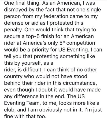 AND THAT FLAG PENALTY IS SOME REAL STUPID BULLSHIT, I HATE IT. I understand why they put the rule in place, I really do, but I just don’t like how it’s been playing out so far this year. I’m with Will on this one, that horse tried his guts out to get himself over that fence, and the majority of his body definitely made it through the flags. The horse still had forward momentum, he made every effort to jump it with his whole body as best he could… I just don’t like a rule that punishes that. There has to be a better way. Also Will totally said on Facebook what all of us have been thinking for a while: