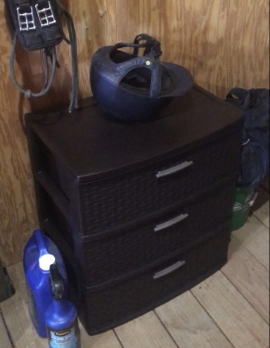 Everything fits with room to spare, with my bathing bucket and grooming bag stacked next to it. I think this will be easier to work out of with the daily items, and the tack trunk with all of it’s less frequently used stuff is over in the storage barn. It’s nice to have the drawers to keep thing separated and easily accessible.
