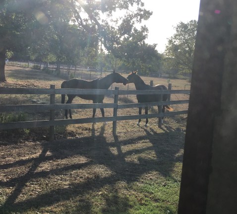On Sunday it was the boys’ turn, and I rode Henry early in the morning then loaded all my stuff up (which only took 4 trips to the trailer, let me be proud of myself for a second) and away we went. We unloaded them and took Henry to the barn, while Presto went over to the front pasture and went out with an older mare and a yearling. As predicted, he and the yearling were fast friends. I think it took all of 10 minutes for them to engage in their first game of Bitey Face.