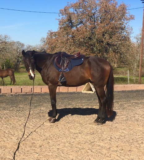 Once I’d practiced his voice commands both ways, I hooked up the long lines. One little squeeze on the left rein to move his nose left, one little squeeze on the right rein to move his nose right, and I was satisfied that he remembered what the bit means, so off we went around the arena. We turned, we went straight, we circled, and we made a somewhat drunken attempt at a serpentine. It’s a little hard to ground drive him because he’s almost TOO sensitive and turns a little TOO well. It would be a lot easier from the saddle where I could use my leg and body. But, he definitely remembered it all, and he did everything I asked, as if he does this every day. I halted him and took the long lines off then led him over to the stepstool, jumping up and down and leaning my body over the saddle from both sides. Again, never moved a muscle. At this point we were all of 15 minutes in and I had accomplished everything I had set out to do. I slid down and declared him to be the most boring baby ever.