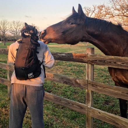 The corgi rode in his K9 Sportsack when we walked the property, and Presto was OBSESSED.