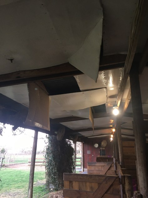 Luckily it WAS traveling really fast, so within 20 minutes it had passed over. I went out and checked on the horses, who seemed to have not even noticed. The rain had blown so hard that the entire aisle of the barn was soaking wet, but the horses and stalls were dry. Some of the ceiling insulation had blown out and I saw a lot of little scattered branches, but in the dark it was hard to tell much else. Since the horses and structures seemed to be fine, I went to bed.