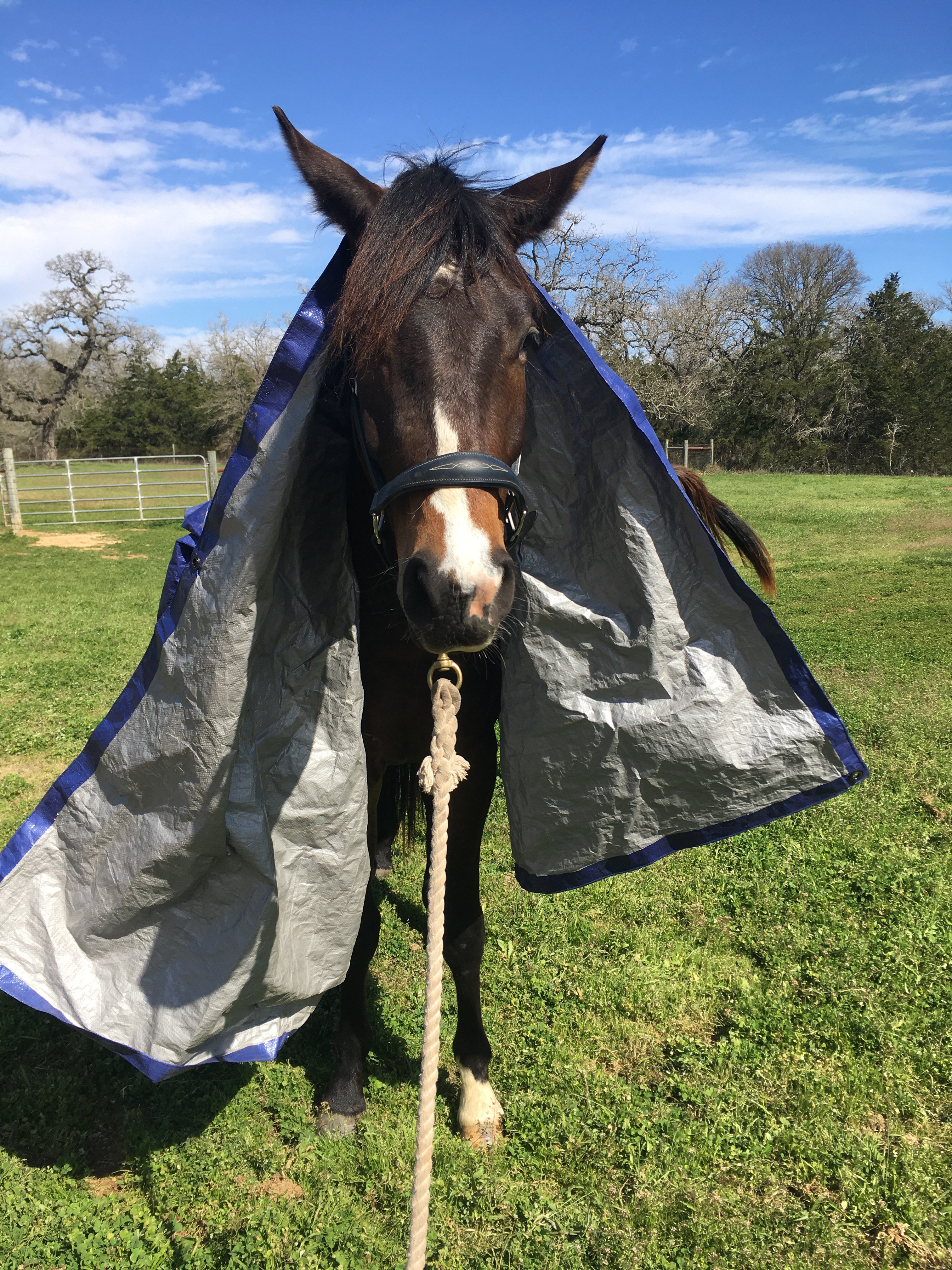 Over his back it went, first folded up small, and then unfolded to full size. No reaction. I flopped it, I flapped it, I waved it around in the air behind him… yeah nah, that’s just a boring tarp, ma. Ok fine then. I fashioned him a cape (securing it in front with a hair band, so I could quickly yank the whole thing off if needed) and sent him out to walk and trot around me.