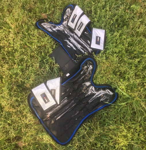 My first impression is that they were way heavier and more substantial than I expected. Most of my ice boots have been pretty light (bordering on flimsy, if I’m honest) and these had some real heft to them due to the substantial inner ice pack. They come in a carrying case to make them easier to transport, which is really helpful for toting them to lessons or schoolings or shows. The velcro is very heavy duty and secure, and the outer material (meant to reflect sunlight to keep the boots cooler) is extra rugged as well. I lovingly call these things the Space Boots, because they legit look like something NASA would make. They’re also longer than other ice boots I’ve had, covering everything from the knee to the hoof, and you could position them slightly further up or down depending on your needs. This is a big perk for me with a horse that has a slightly lumpy right knee.