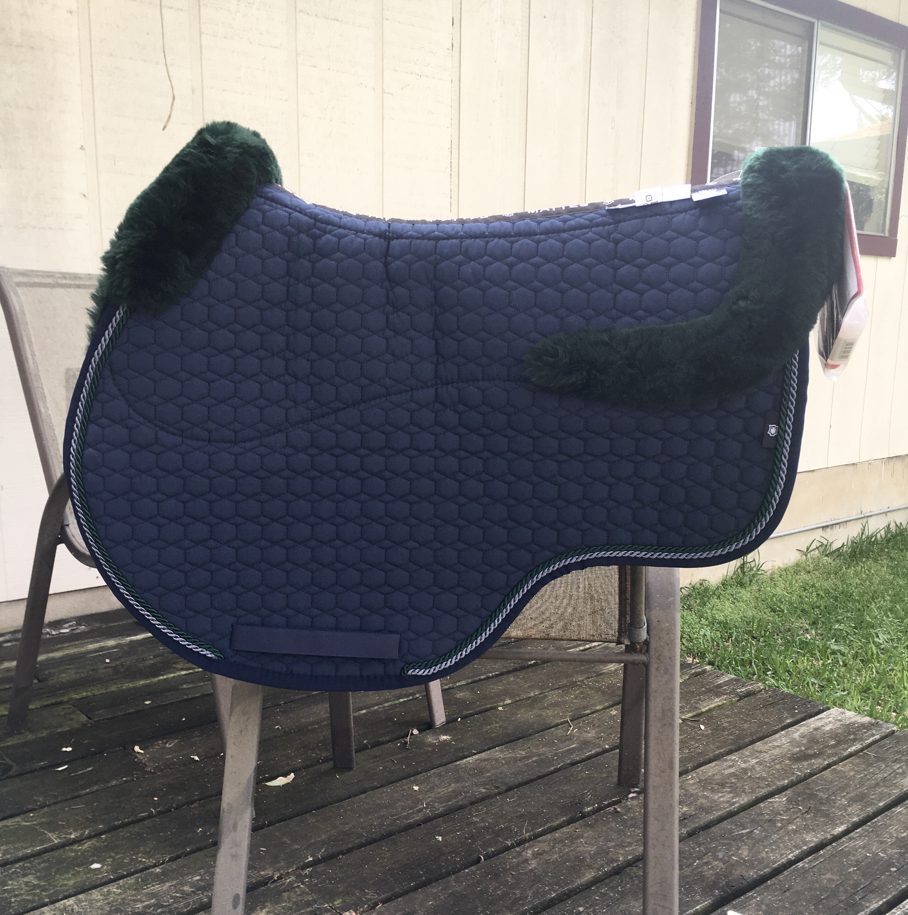 It’s a little hard to tell in the picture because my phone just could not get the color right, but it’s navy with dark green sheepskin, and gray and dark green piping. The sheepskin runs along the underside of the panels as well. I kind of wish I’d gone ahead and gotten the correction system built in, since this one is for Presto, but I didn’t since I already have a correction Mattes half pad for him. Right now he is in a real funky, weedy stage, so I’m definitely having to use the correction system. For now this one will be living in my trailer, waiting for Presto to a) fill out b) be a show horse. It’s a really pretty trailer decoration though.