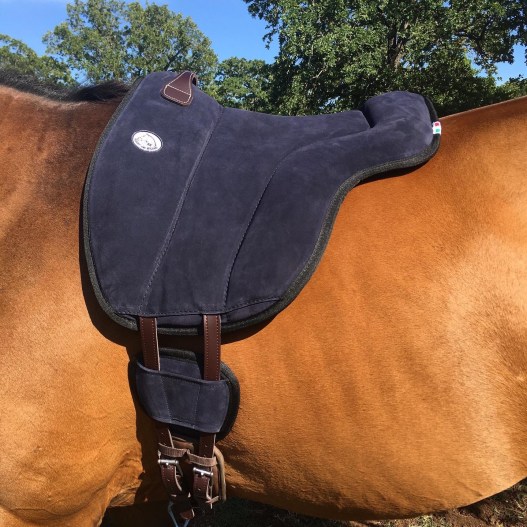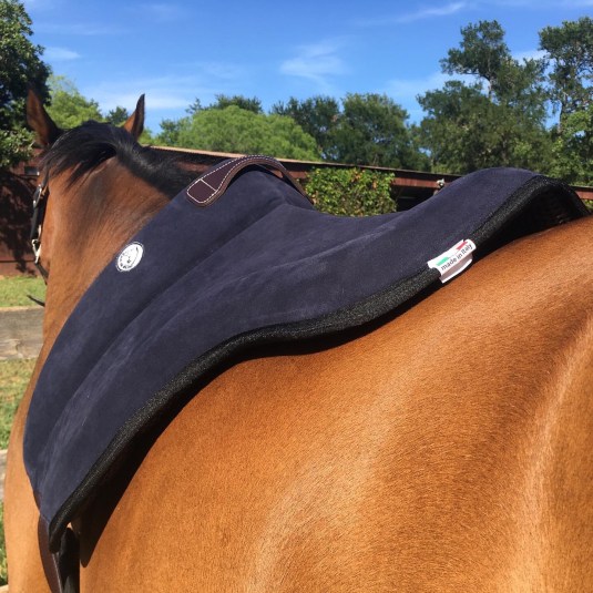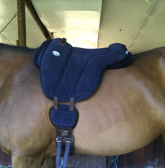 Initial impression out of the box: it’s definitely beautiful. It’s finished well, the suede is luxe, and it has the structure I was looking for. It comes with a neoprene girth or you can use a short girth you already have. I had already fully intended to use my own girths that I know Henry likes, which was the reason why I wanted a pad with the english style girth straps in the first place. The next question was what, if anything, did I want to put underneath it?