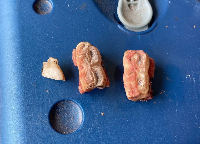 Overall his teeth look pretty good. Nothing crazy or super out of the ordinary. He was due for a float, but his mouth is developing well and properly. Somewhere around 3 1/2 is when they start shedding another set of caps, and he was right on the money for that. One of the front ones was so loose that Dr. Moore just tapped it with his tool and it fell out. Another front one took 3 taps. Basically all of his 3 1/2-year-old ones were in the process of coming out, so he went ahead and helped them along the way. Especially two in the back that were starting to pack food between the cap and the adult tooth – those were getting a little stinky.