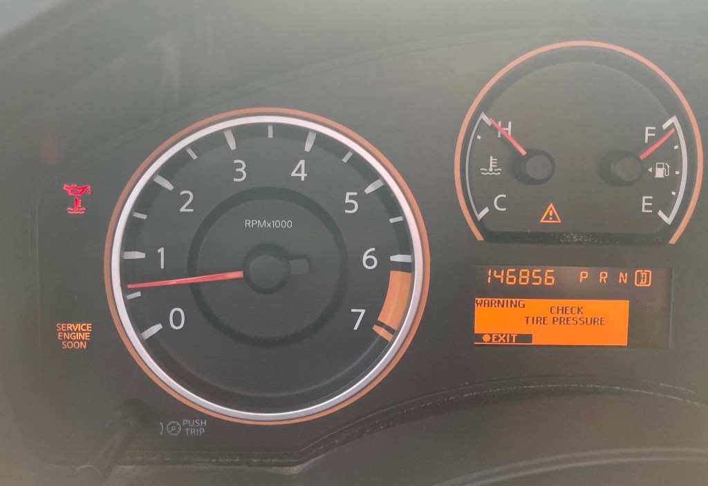 Anyway, so on Friday they called me to come pick her up. I was so relieved to have her back. I paid my deductible, they brought her out front all clean and shiny, I hopped in, and away we went. Reunited and it felt so good. The body shop isn’t far from my house, a few miles, just a short jaunt up the highway. As I was on the ramp getting onto the highway, my oil temp light came on. I thought hmmm that’s odd, what the heck. I had already decided to pull over and call the body shop back, once I could safely get off the highway. By the time I merged into traffic, I noticed the heat gauge creeping up at an alarming rate. Then the check engine light came on. All in very rapid succession, maybe a minute. Um. WHAT THE FUCK. I took the first exit I could, and as I was limping down the exit ramp to pull over the engine started to sputter, and I noticed the temperature gauge was now all the way at the top. I slid over immediately into the first parking lot I could, snapped a picture of the dash real quick, turned it off, and called the body shop.