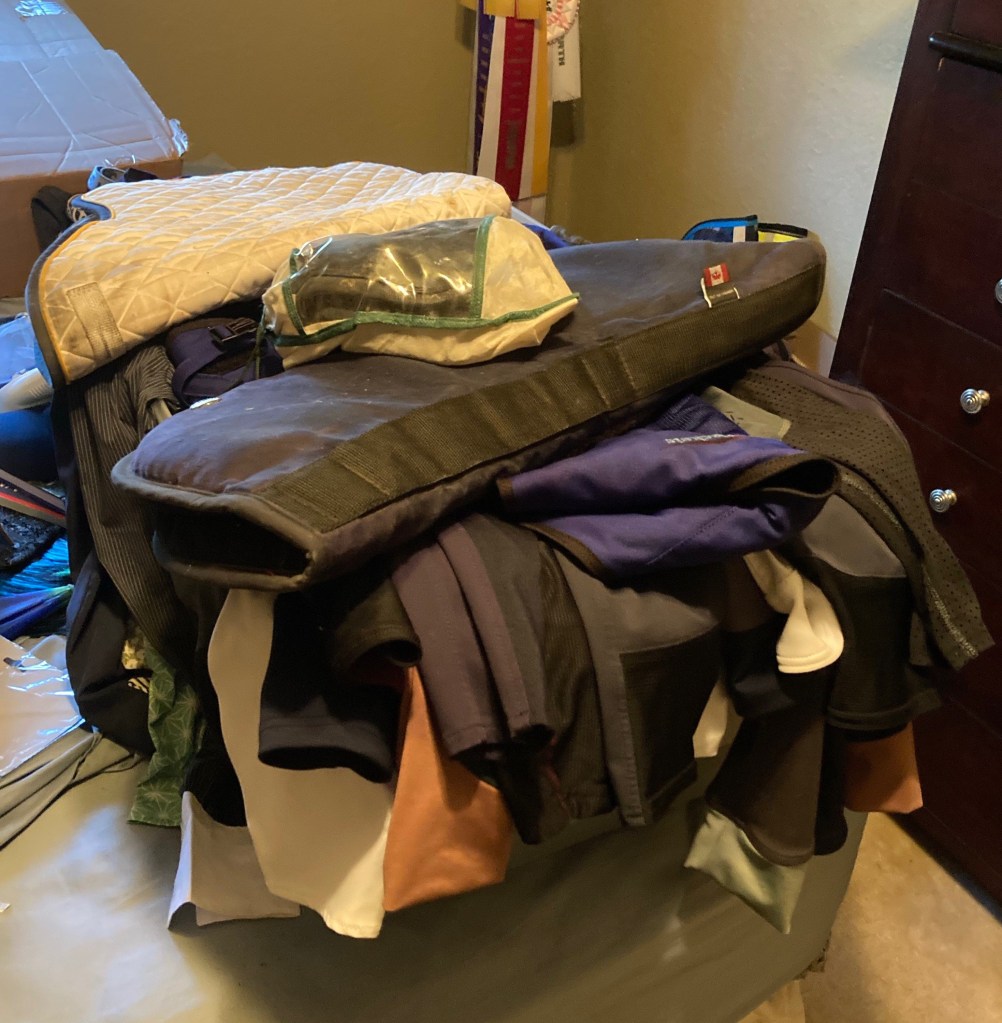 I found a taker for my massive collection of horse books, so that’s good – those are leaving this weekend. Once all this smaller stuff is out of the way it’ll be on to the furniture and most of the kitchen appliances, which I’m tempted to set out in the yard and have people come take. I’m super over it at this point, I just want it all to go away with as little effort from me as possible. Evidenced by the fact that I became so ruthless in the process of cleaning out my closets that I now have 11 non-riding or non-barn shirts left to my name. Whatever. That’s enough. At first I was carefully going through everything, thinking about each item, waffling over whether or not to keep it, blah blah blah. But there are 7 closets in this house. SEVEN. That seems excessive for a 1500 sq ft house, no? Yet somehow they were all full of crap. We had 18 blankets. WHY DID WE HAVE 18 BLANKETS, WE LIVE IN TEXAS. This is what happens when you give people 7 closets. I ran out of give-a-shits by closet #3 and pretty much everything went straight into trash or donate after that. Done.