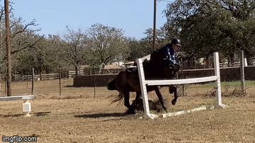 The field has too many trees/bushes/hills for my Pivo to work very well (granted I could have at least turned it on during the flatwork part but I wasn’t really thinking), so I’ve not been videoing any of his work out there up to now, but I did at least prop my phone up on Saturday to try to get something. Much love to the baby horse that is totally ok with me carrying and setting up my tripod from his back. Henry loses his shit when I try to telescope the legs. The only problem with Presto is that he wants to play with the tripod. It’s crappy footage, but you can see a bit of what he’s working on anyway.