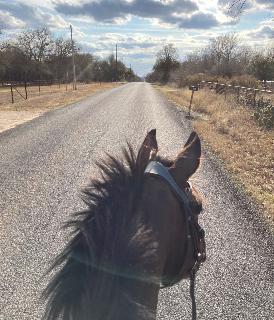 Last week he went on his first little road hack. I ponied him out there a couple times last winter, but this was his first time venturing out on his own. The vet wanted me to do long walks to help the swelling go down in his knee (good news – knee is now back to normal, the cut is pretty much healed, and he finished his antibiotics yesterday) and my front gate happened to be open for once, so I added a little road loop to the middle of our hack. He’s seen enough by now to where it was interesting but not worth getting particularly excited about.