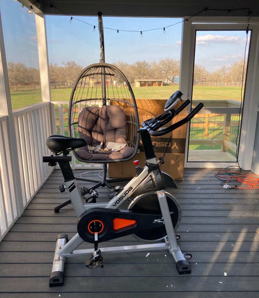 It’s not anything fancy like a Peloton, I definitely don’t roll that deep, it’s just a very basic no frills Amazon special that no one would ever fawn over but it gets the job done. It finally showed up on Wednesday and honestly since it had been 3 weeks since I ordered it (one and a half of which was the winter storm subreality from hell) I had forgotten about it. Surprise! It was pretty easy to put together at least, and she’s got a really nice spot on my back porch where I can look out at something besides a wall and get a nice breeze.