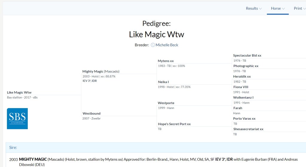 The first thing I usually do is go plug the horse’s name into Horsetelex and Hippomundo. Yes, I always do both. They’re both good databases, but each has their pros and cons (Hippomundo is sometimes missing horses that Horsetelex has, but Horsetelex often isn’t as up to date on performance results as Hippomundo). So I usually pop open two tabs and search for the horse in both sites. If all you want to do is look up a horse to view it’s basic pedigree, they’re both free for that function. Fun Fact: all 3 Belgian registries (BWP, sBs, Zangersheide) have a partnership with Hippomundo, so any horse registered with one of those 3 registries is automatically entered into Hippomundo (as of… 2012ish? I can’t remember when that started.). If you’re looking for a Belgian-registered horse, Hippomundo is your place. For example, Presto is registered sBs, so they entered him when he was issued his papers.