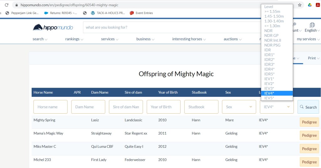 If you want to look up the sire, same steps. Hippomundo makes it easier to sort the stallion’s offspring though, like for instance I can go into Mighty Magic, get a list of his offspring and then say “Ok, I want to see how many have competed to X level in X sport” by using the dropdown