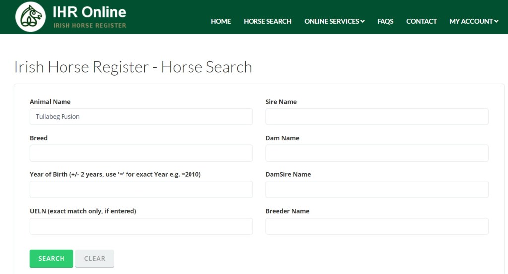 Horsetelex and Hippomundo are especially lacking in the Irish horse pedigrees, probably because none of the aforementioned farmers have come along and put any of this information in, particularly further back down the line. So, if you have an Irish horse, my suggested database to use is the Irish Horse Register. You need an account but it’s free. You can go to their Horse Search page and search by any of the listed criteria. IF there is any pedigree data to be had for the horse, the IHR is the place that will have it.