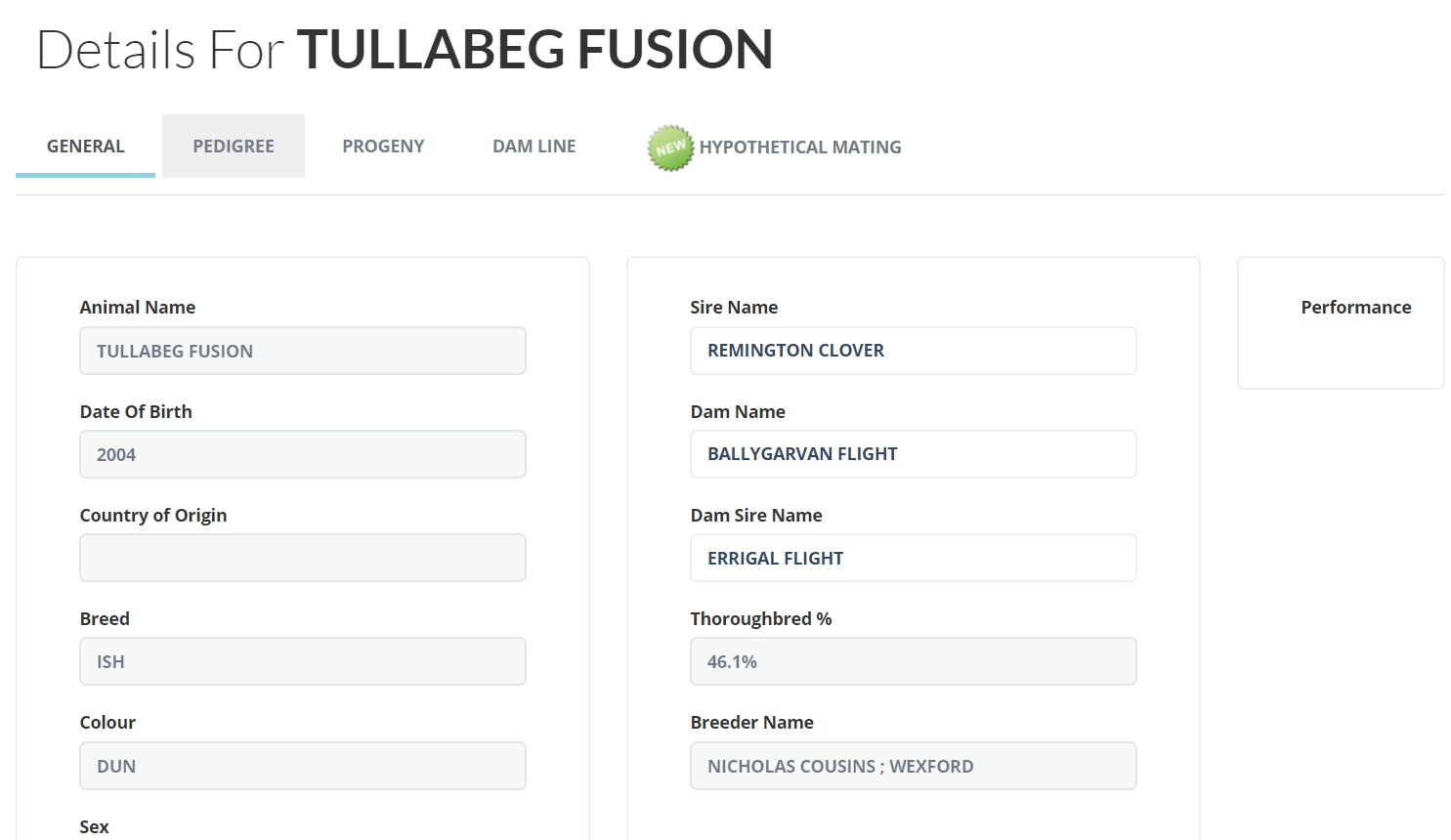 Horsetelex and Hippomundo are especially lacking in the Irish horse pedigrees, probably because none of the aforementioned farmers have come along and put any of this information in, particularly further back down the line. So, if you have an Irish horse, my suggested database to use is the Irish Horse Register. You need an account but it’s free. You can go to their Horse Search page and search by any of the listed criteria. IF there is any pedigree data to be had for the horse, the IHR is the place that will have it.