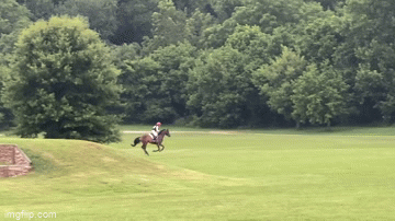 From there they had a loooong gallop out into the back field, which unfortunately we couldn’t see very well. Fence 5 was out of view, but I could see the ditch and boat of the coffin way off in the distance between the trees, which he jumped through without hesitation. Good kiddo. From there he disappeared behind trees again and I was very impatiently waiting for updates from the announcer, since we couldn’t see the water at all. It wasn’t long before he said “here comes Like Magic WTW and Megan Sykes confidently back into the main field” and there they were popping over the stone wall and headed toward the downbank combo. He looked to be cruising along easily.