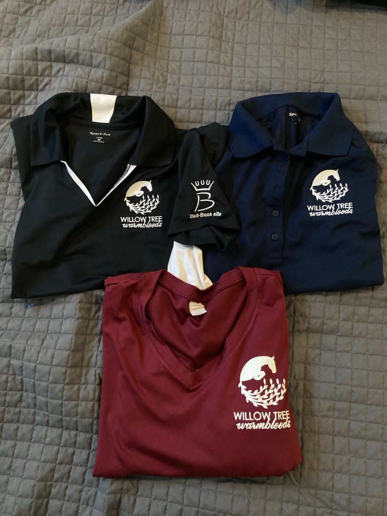 Black and white short sleeve polo size Medium, embroidered with the Willow Tree Warmbloods logo on the chest and the sBs logo on the arm. Worn twice. – $15