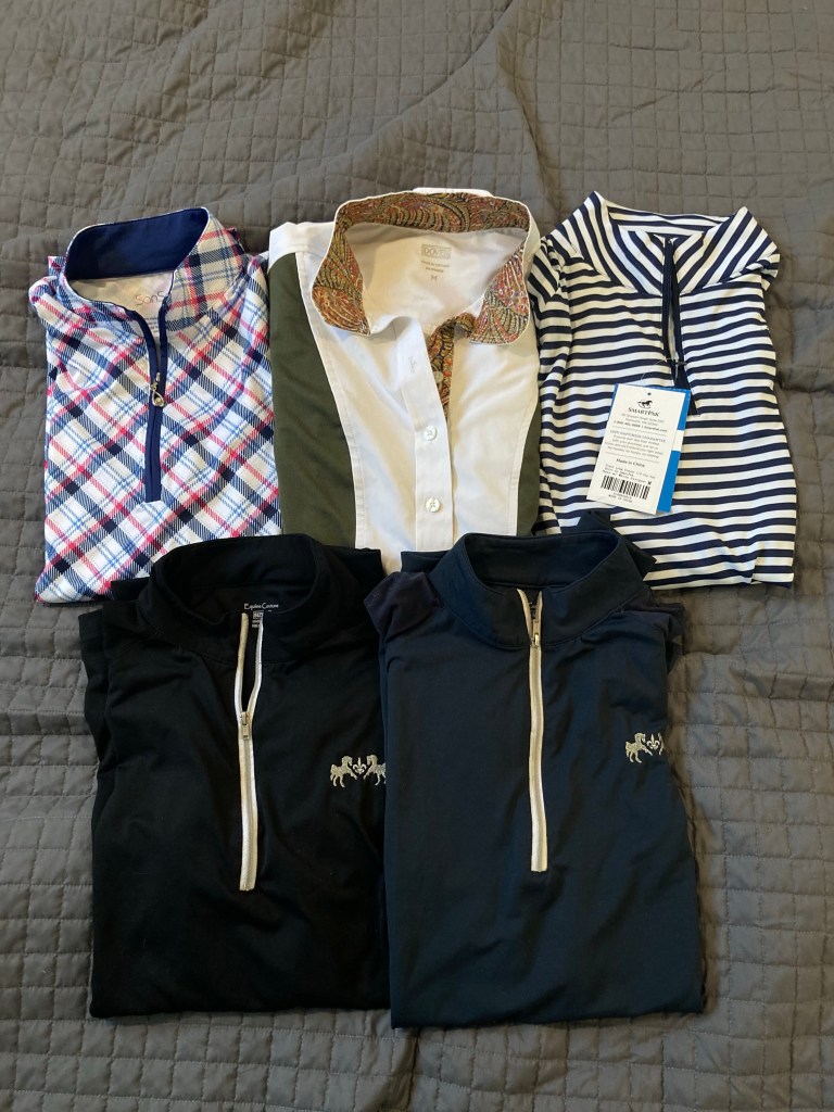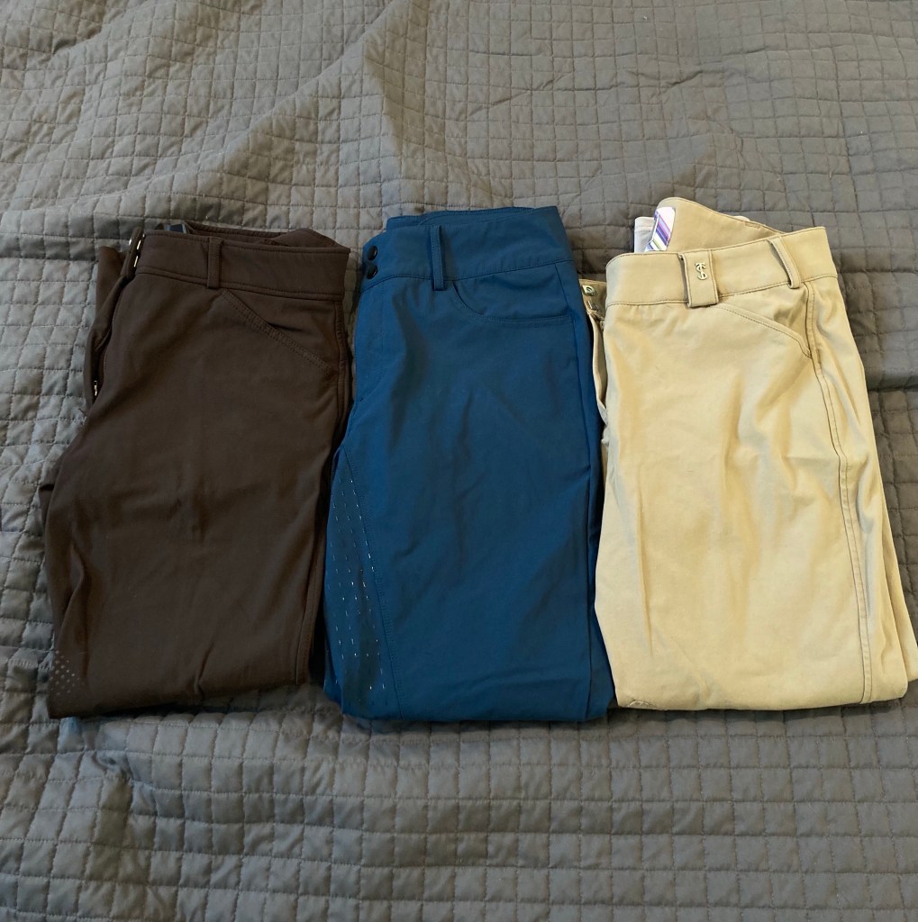 BALEAF silicone full seat breeches size small (fits like 28) These are the Amazon breeches that I like so much and while I wear the black ones a lot, these are more of a deep teal than navy, and it’s just… not my color. I tried. I’ve worn them twice. $30