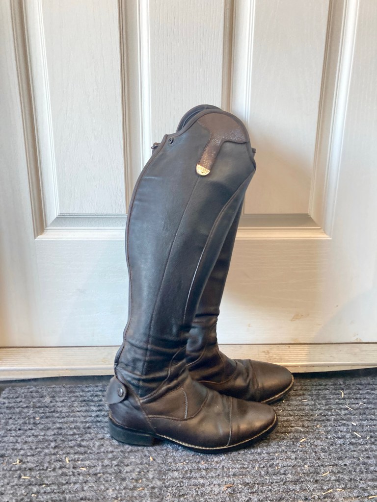 Pioneer Atena semi-custom chocolate brown dress boots, size 39 4A. Calf measures 14.5 unstretched (the entire outside panel is elasticated, so there’s a lot of potential stretch factor), height 19.5” from floor to back of knee. The top has an embossed floral design. Not much wear because I was saving them for shows, but jokes on me now. $200