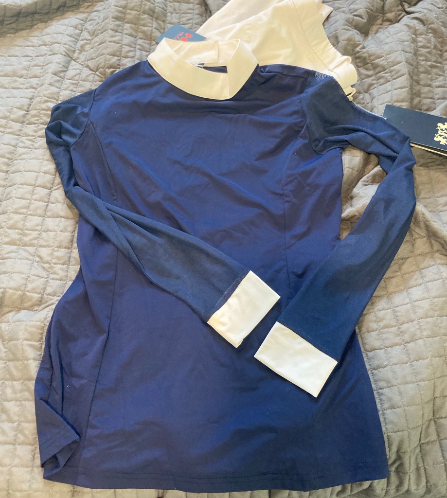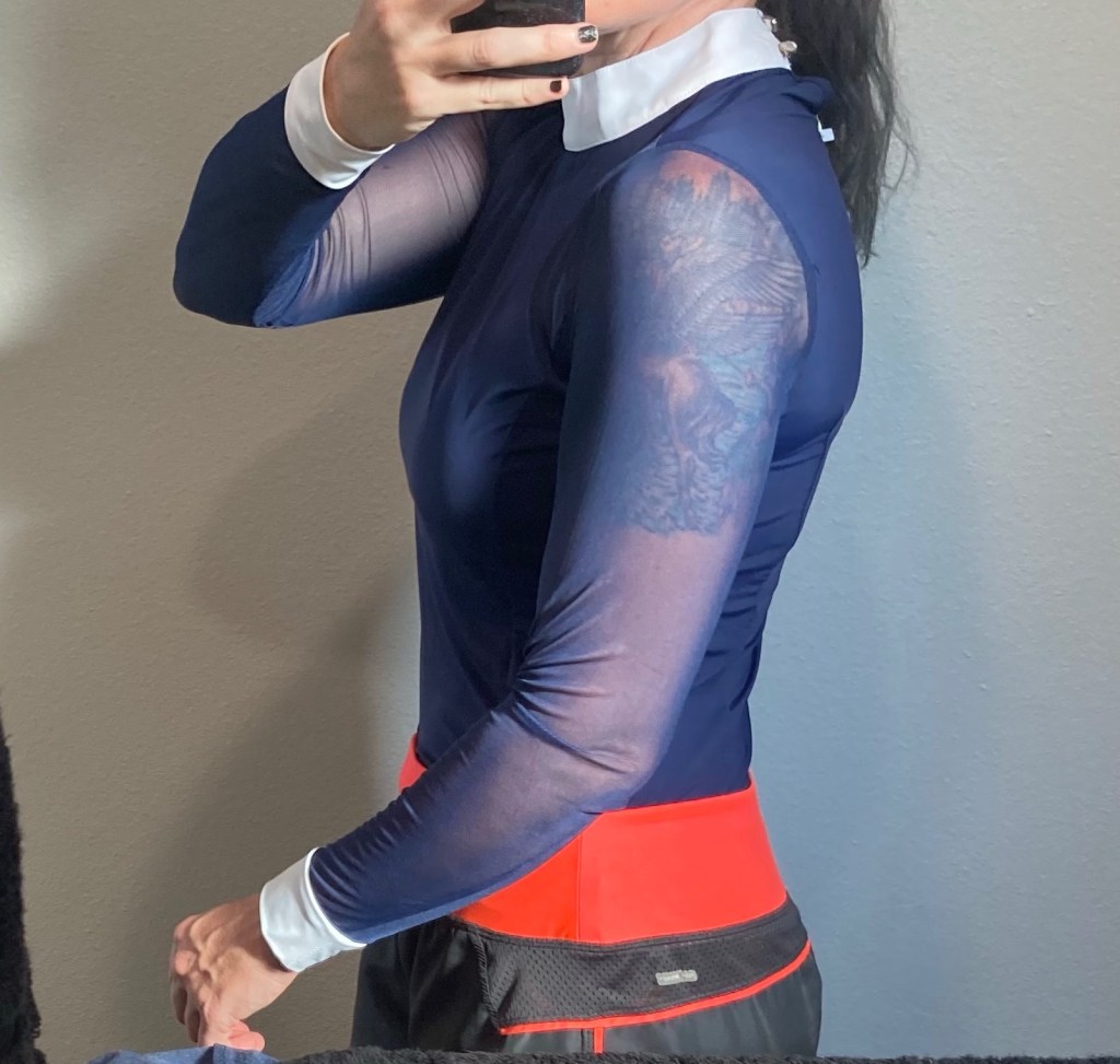 The week before that, when I was still high off my $40 amazon breeches find, I had ordered a show shirt from another Amazon company. I found it kind of by accident, hidden in a listing for sunshirts. They had navy and gray, both with full mesh sleeves, so I took a shot and ordered the navy one. The all mesh sleeve is really appealing to me because I’m pretty much always at shows that are hot, so I wear my Motionlite coats, but if you wear a short sleeve shirt under those you can always see the line really easily, which drives me nuts in pictures. The mesh sleeve seemed like a good compromise – you’d get the bit of white cuff at the wrist from the long sleeve, and the sleeve would be a nice flat smooth profile under the arm of the coat, but the mesh would be cooler than a regular long sleeve. In theory, anyway. I didn’t have super high hopes for a $30 shirt but figured what the heck it was worth a shot.