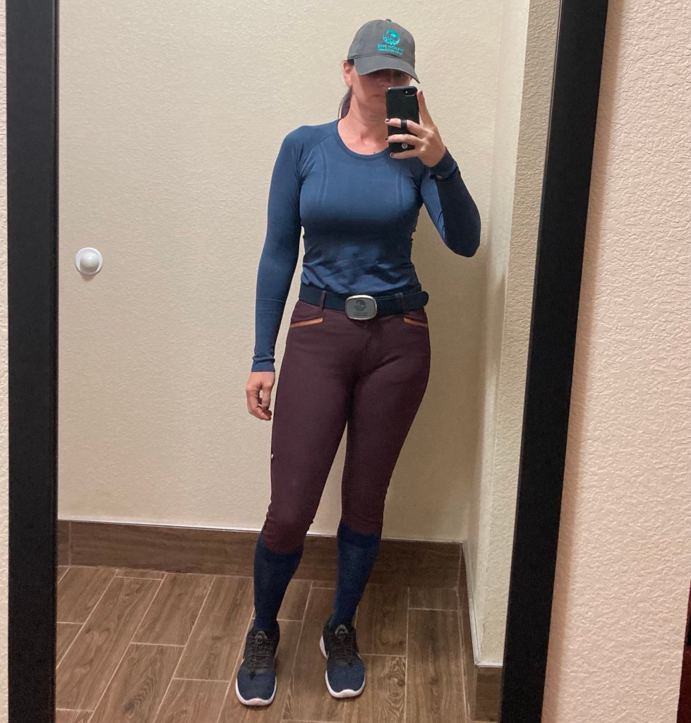 First of all the fabric is a bit thicker with more of a cottony feel to it, which isn’t my preference. I’m into the sleeker mega stretchy tech fabrics so this just isn’t my jam. They definitely run SMALL as is normal for Equiline, these are an I-42 and are definitely snug. The little styling details are cute, with the pocket flaps on the back and signature Equiline pocket square and leg triangle thingy, but what kills me with these is the rise. They’re just like… a half inch to an inch shorter than I want them to be, and for some reason they really just want to climb right up into my crotch. Like…. there’s a borderline camel toe situation when I get off the horse. Also the front pockets are too small for me to securely fit my phone into, which is problematic for me.