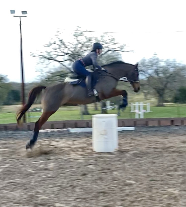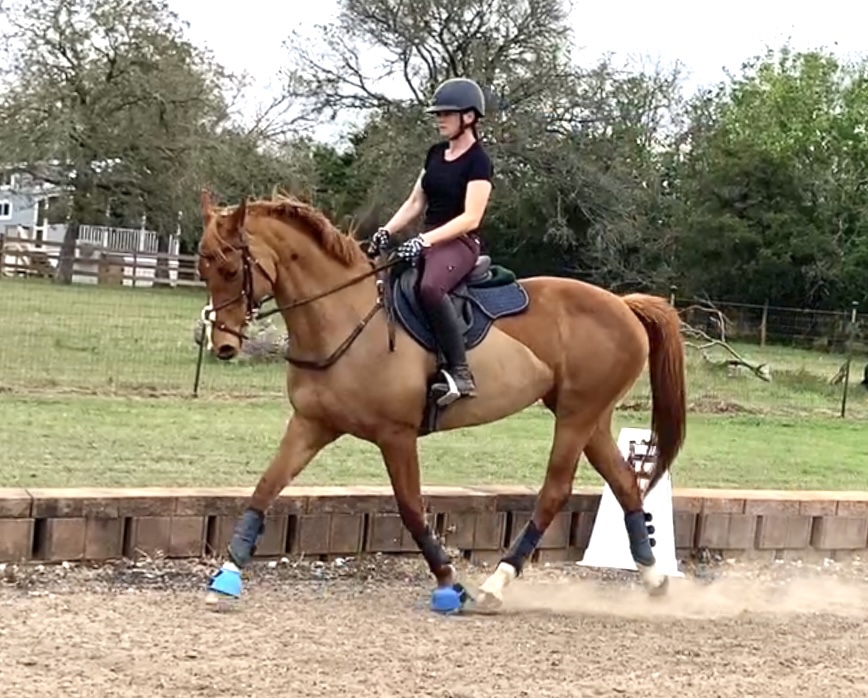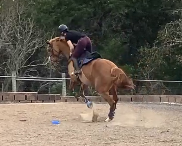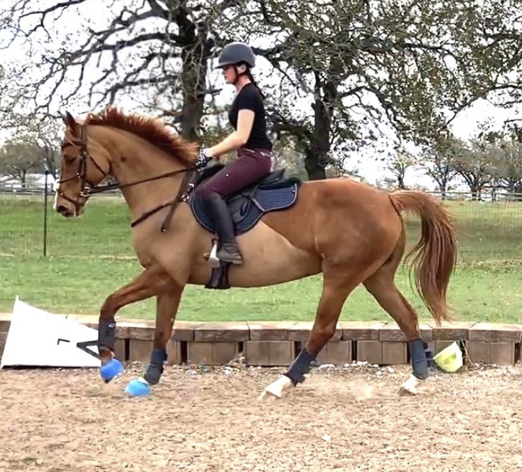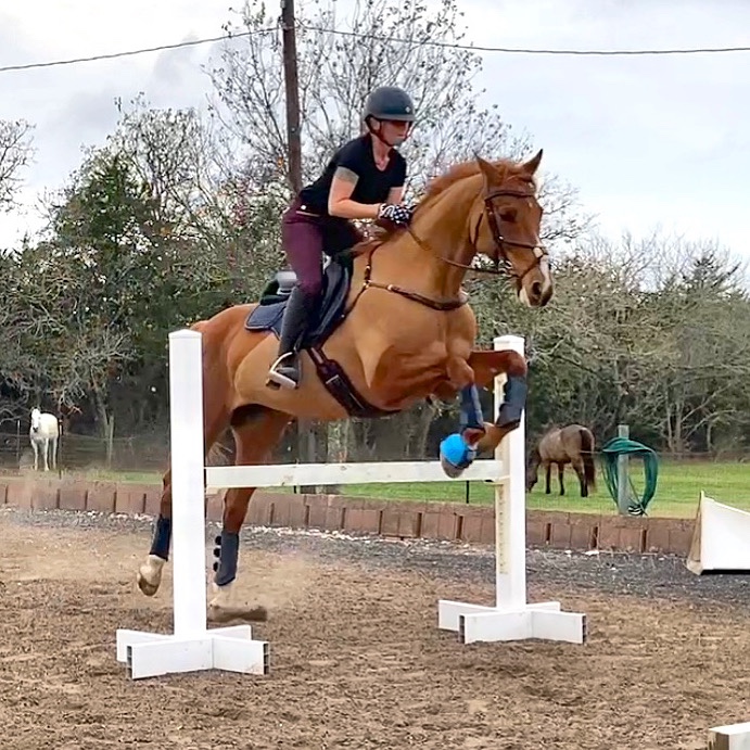 Granted, I almost got yeeted right over her head that day because she “fancy footworked” her way right out of a bell boot, flinging it into the air on the other side of the pole coming out of the grid, causing it to land right beside her as she was cantering away. She thought it was a horse-eating pterodactyl and I had some chestnut mane for lunch. Near death experience for both of us.